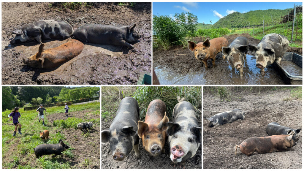 村の耕作放棄地を活用して放牧場をDIY。草刈りから始まり、使わなくなった農業用ハウスを愛知県から組まして移設。「できるだけ自然に近い状態で飼いたい」そんな思いから、のびのびと約1反歩の圃場で、3頭の豚が過ごしています。圃場はちょうど村の真ん中で、ランニングコースにもなっています。豚が自由に走り回ったり遊んだりお昼寝したりそんな姿を見ながら走るのも楽しいですね。